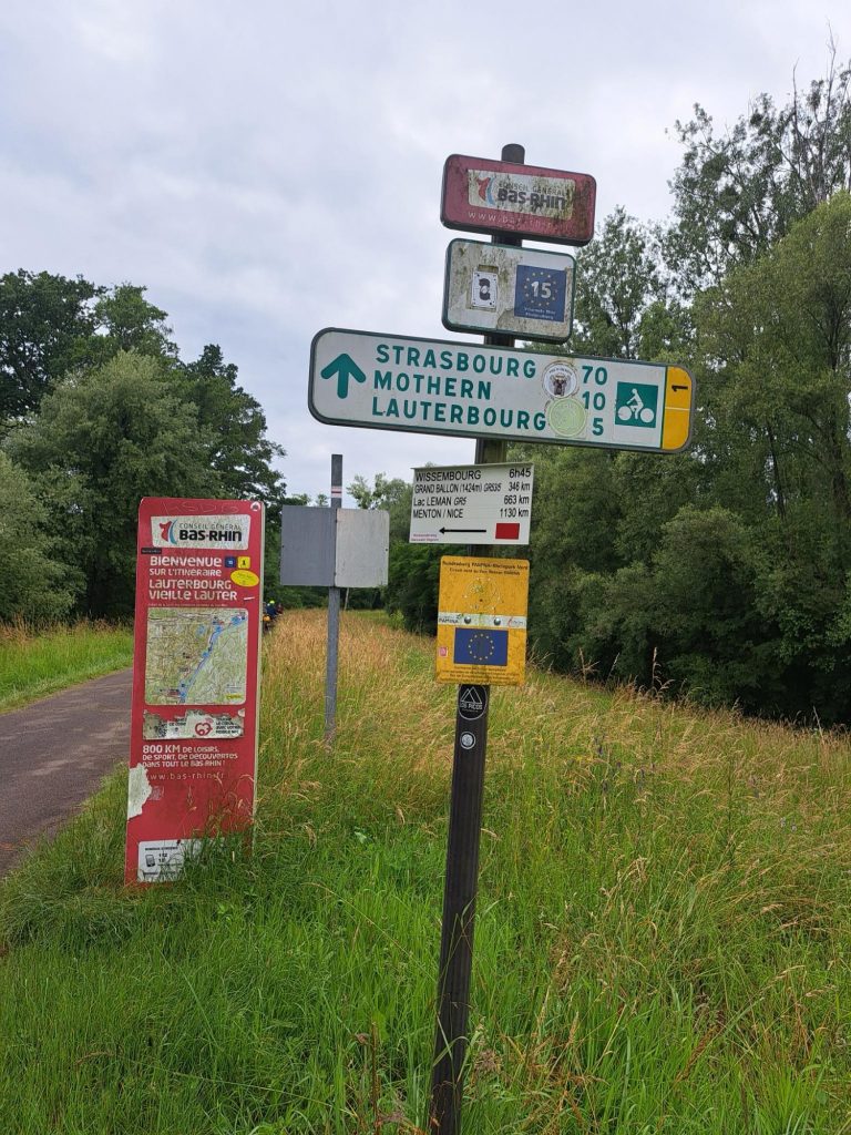Nach einiger Zeit verließ er uns und wurde von Pia-Pedale abgelöst. Sie führte uns zu dem Punkt, dem wir alle entgegen gefiebert haben, der französischen Grenze. Nachdem an Passanten die wenigen französisch Kenntnisse ausprobiert wurden, gelangten wir nach wenigen Kilometern an den Campingplatz, wo der Tag mit Nudeln und dem ersten EM-Spiel erfolgreich abgeschlossen wurde.