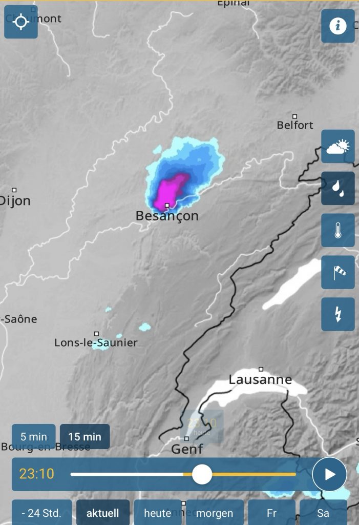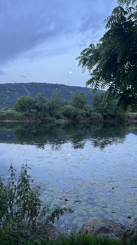Nach einem weiteren Tag mit knapp 30 Grad und Sonnenschein erreichten wir den Campingplatz in der Nähe von Besançon. Mit Blick auf eine wunderschöne Freibadanlage, die leider nicht für uns zugänglich war, schlugen wir unsere Zelte auf. Nun genießen wir die Abendstimmung mit aufgehendem Mond hinter den Bergen und dessen Spiegelung im Fluss.