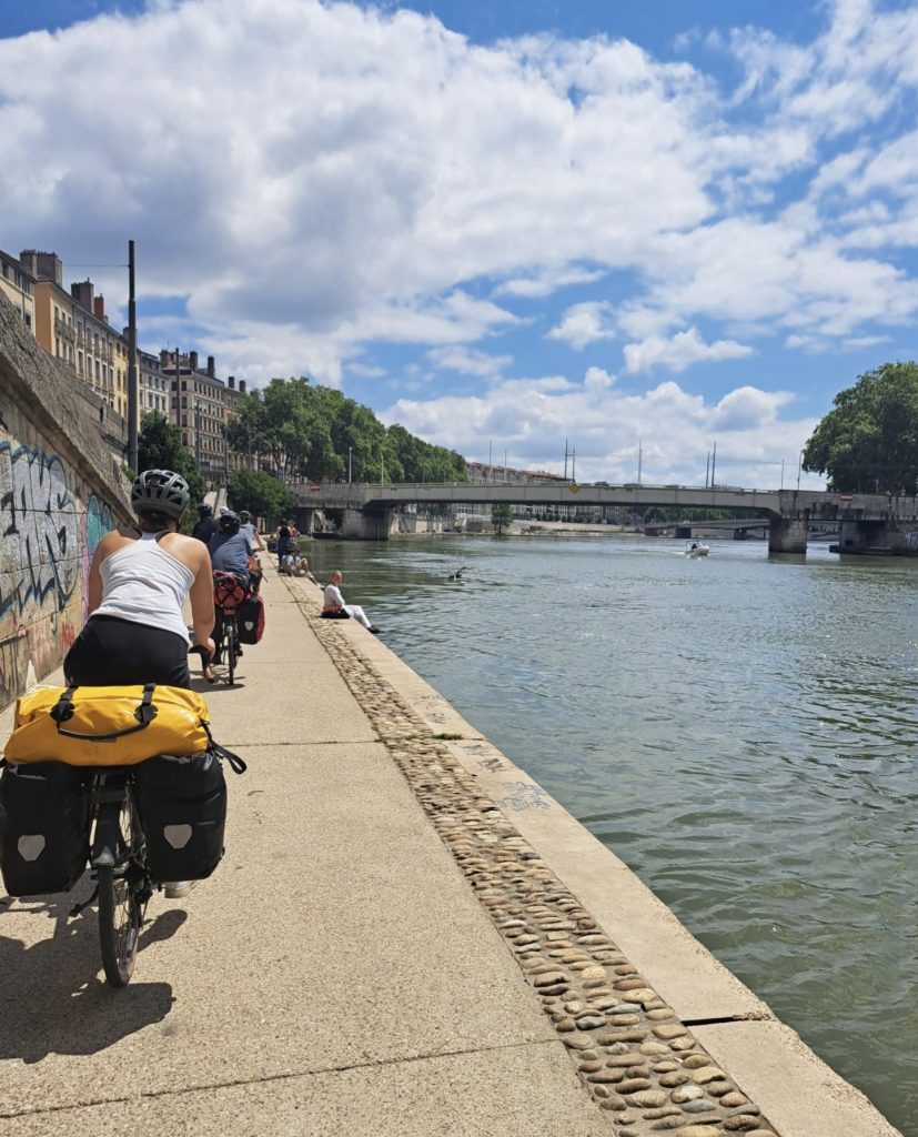 Die frühe Gruppe fuhr dann erst einmal ein paar kleine Straßen am Fluss entlang und über umgestürzte Baumstämme. Nach einem leckeren Frühstück ging es dann gestärkt weiter, sodass wir auch ohne Mittagspause gut aus kamen und nach zwei weiteren platten Reifen in Lyon, der dritt größten Stadt Frankreichs ankamen.