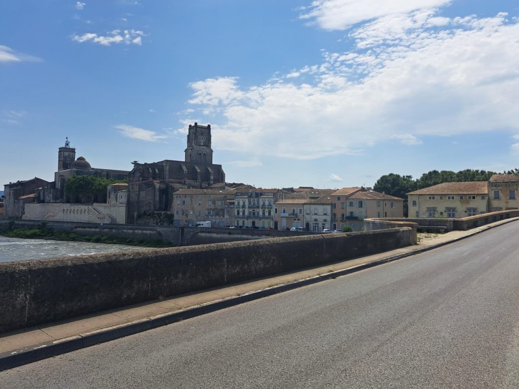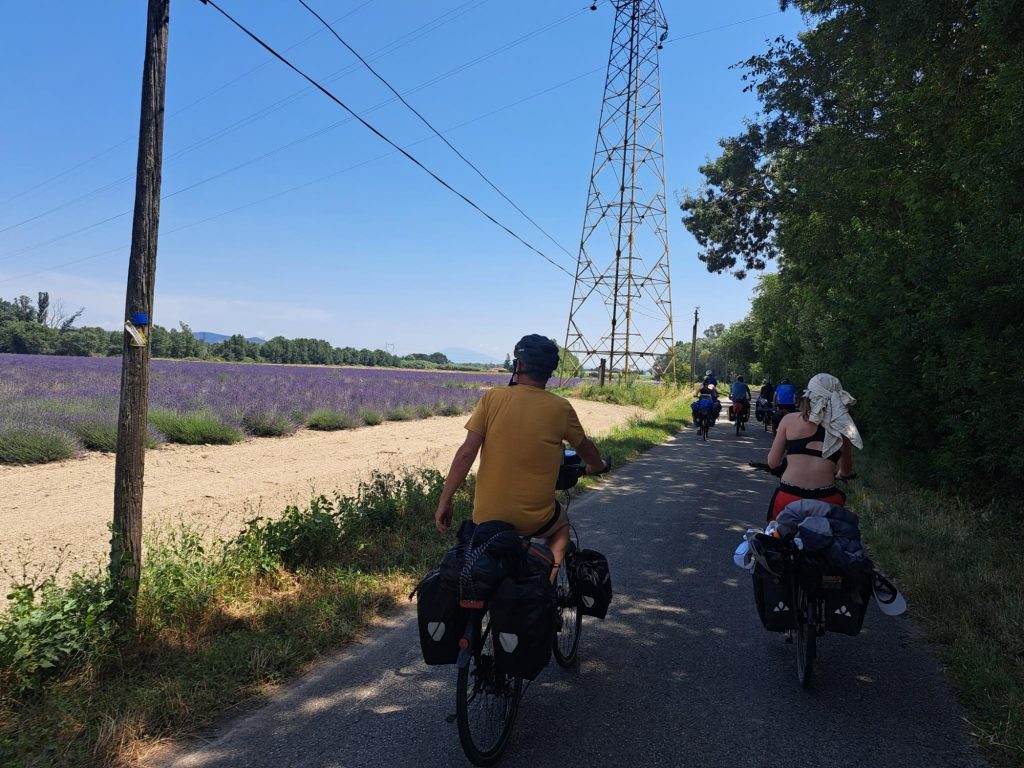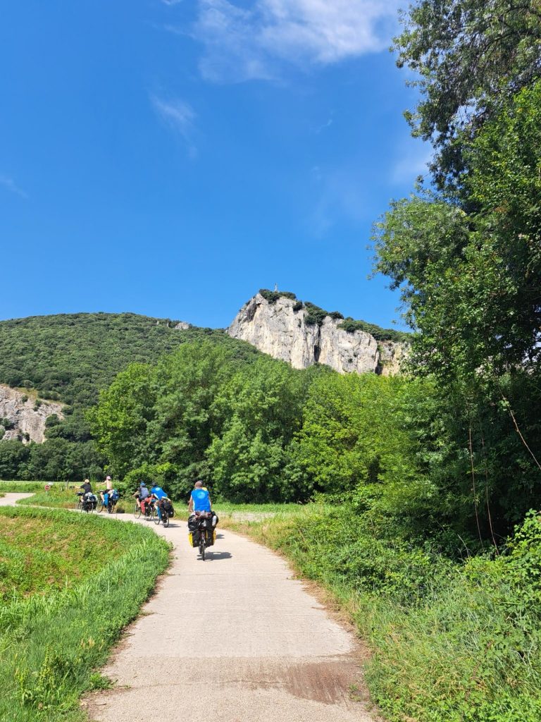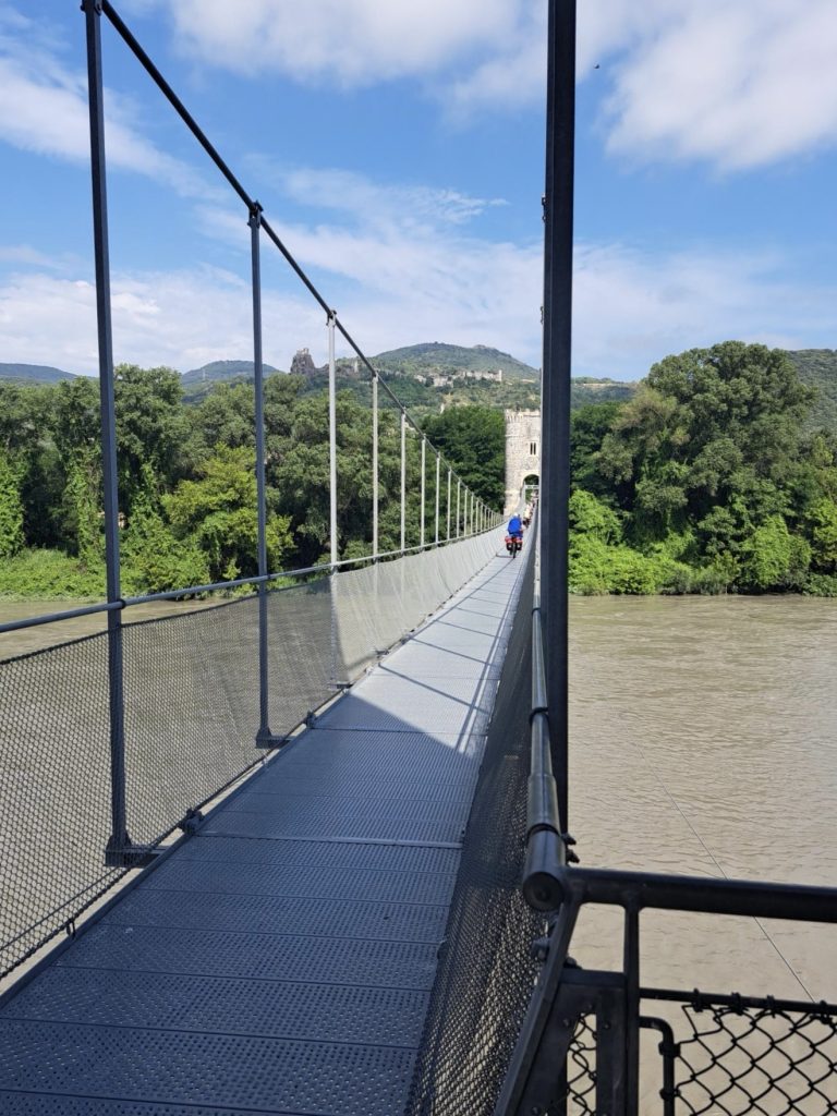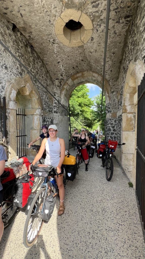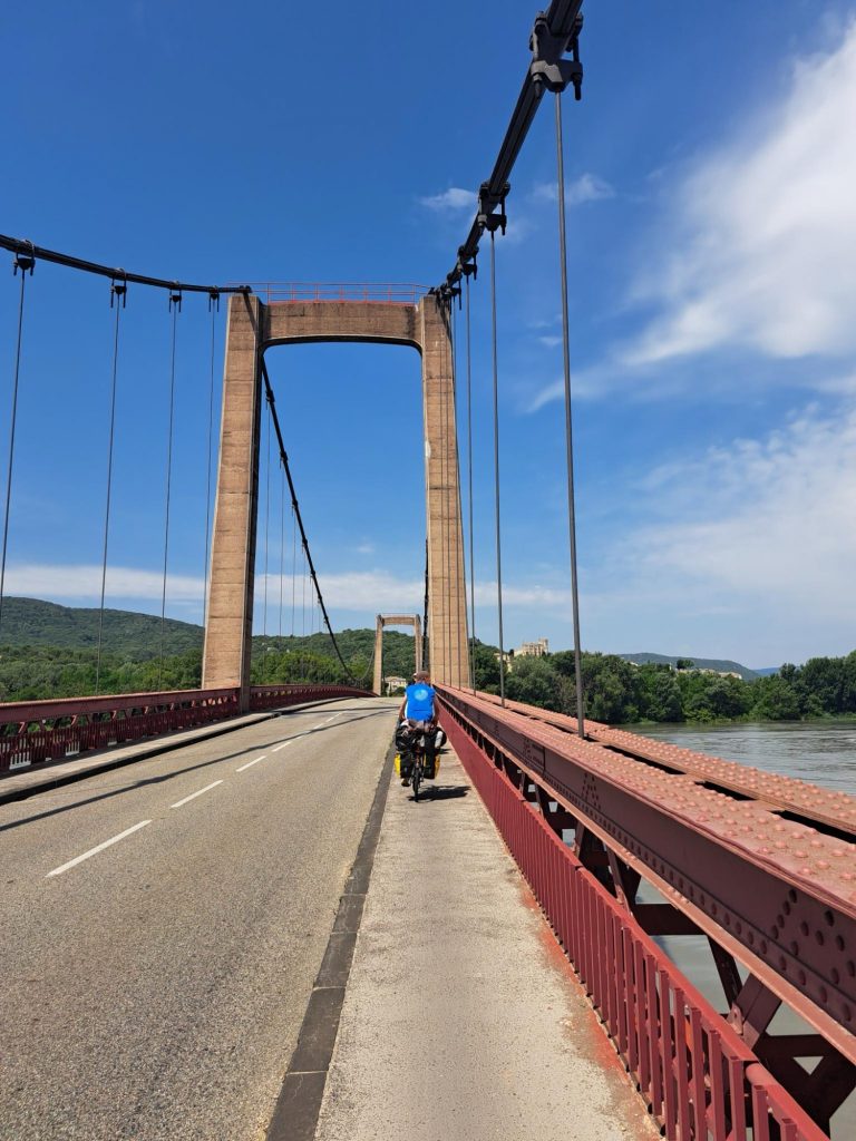 Als wir an der Bäckerei ankamen waren schon alle da und haben ein paar Croissants 🥐 vergenussferckelt. Nach einer kurzen Fahrzeit kamen wir an einer Hängebrücke an, die wir nur einzeln überqueren durften, weil sie sehr schaukelte. Wir fuhren in brühender Hitze mit kleinen Collabier-Pausen ,70 Kilometer.