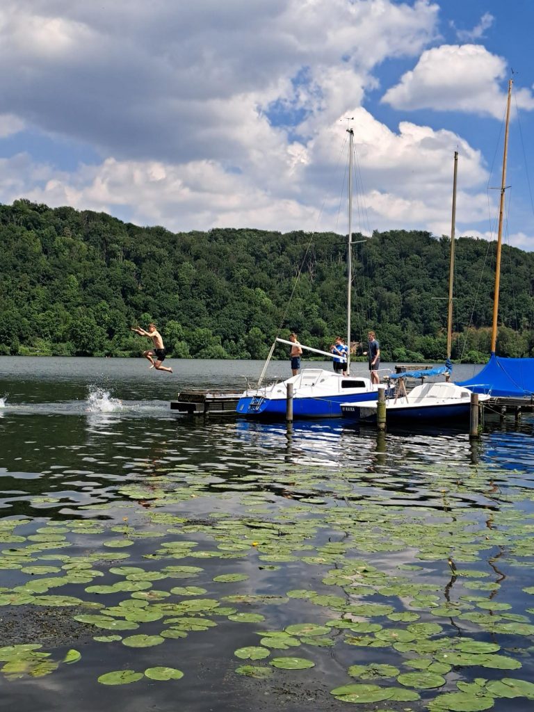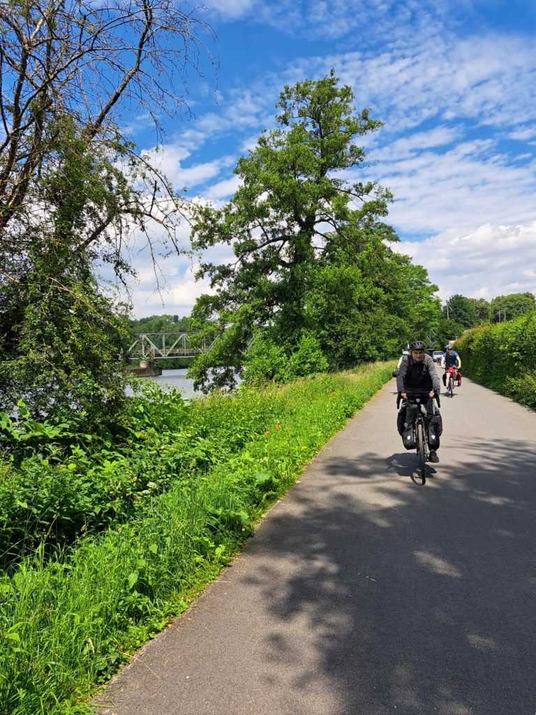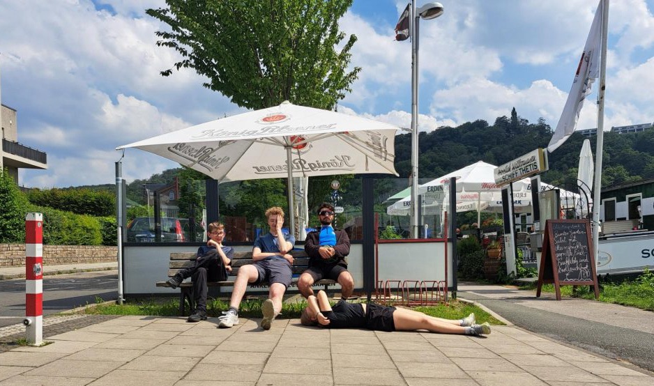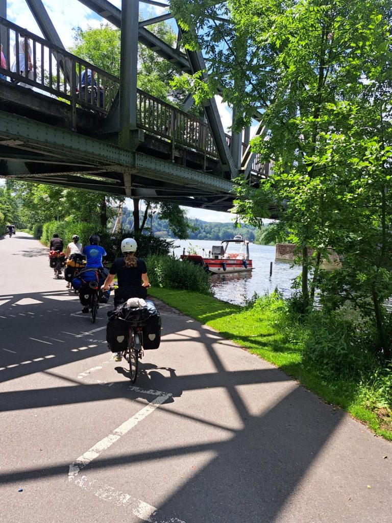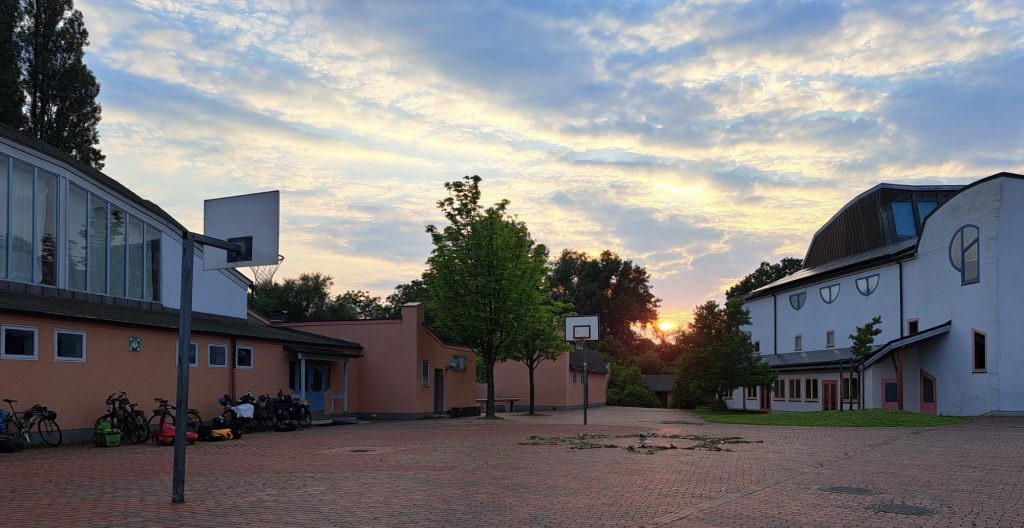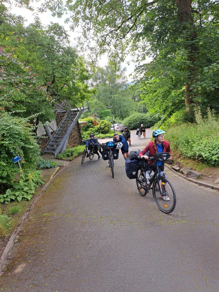 Bevor es dann losging, sangen wir für einen Mitschüler, der heute Geburtstag hat, ein Ständchen. Nach ca. 15 km auf dem Rad frühstückten wir in einem sehr schönen Park. Die heutige Etappe war bisher die anstrengendste mit vielen langen und steilen Bergen. Letztendlich erreichten wir die Ruhr an der wir eine Rast einlegten. Einige von uns sprangen dann sogar ins kühle Nass. Kurze Zeit später verließen wir die Ruhr und es ging zurück in die bergige Landschaft. Nach ca. 65 km erreichten wir die Waldorfschule Düsseldorf. Hier wurden wir wieder herzlich empfangen und schlugen unser Nachtlager in der Sporthalle aus.